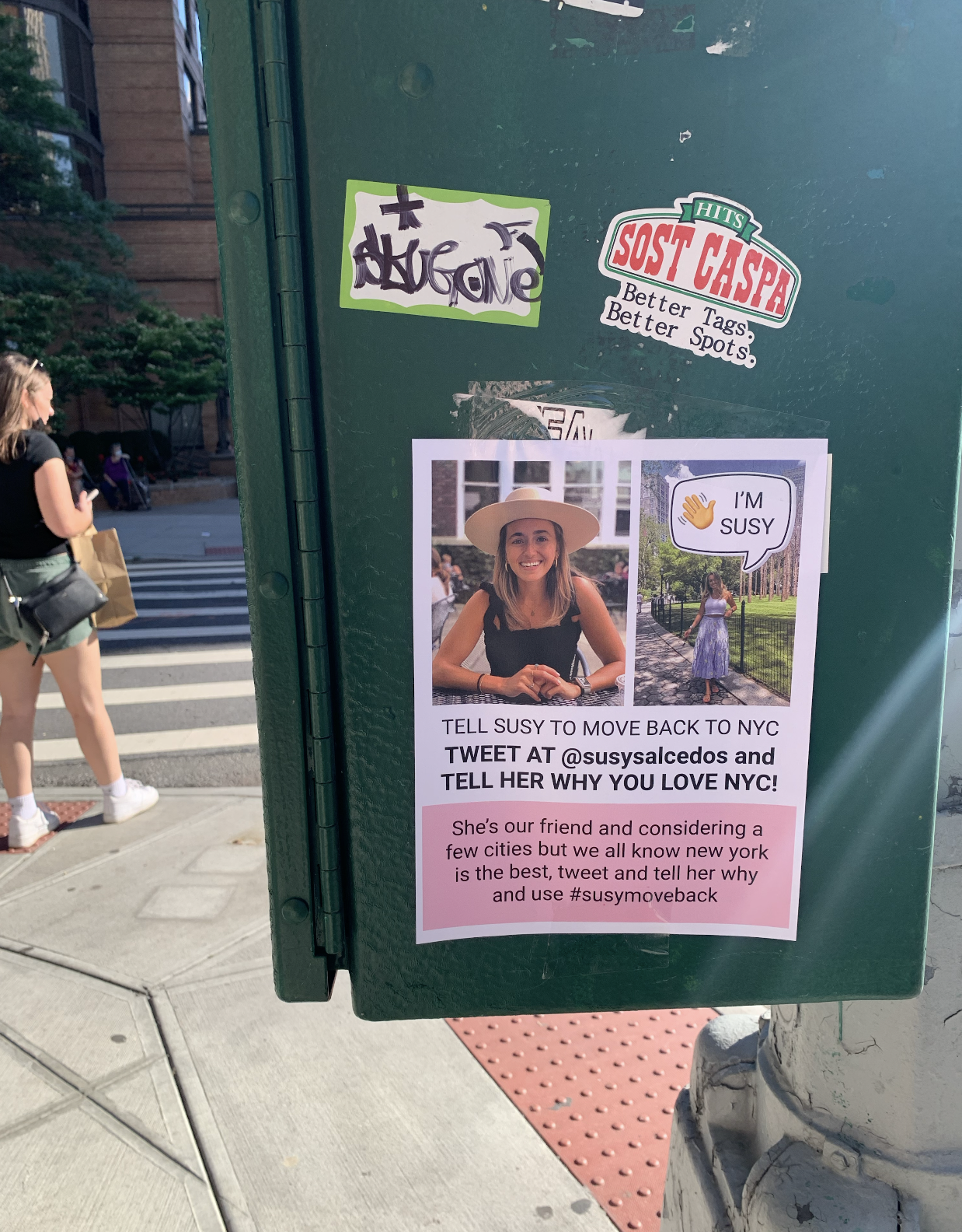 So, I decided to take this issue into my own hands and ask the people of New York for help with some guerilla marketing. I pasted about 50 posters all over the city and waited to see what came in. We received about ~15 comments back from the public. All in all, it wasn’t a success in a true sense, Susy picked Austin, but it was definitely fun, she enjoyed it.
